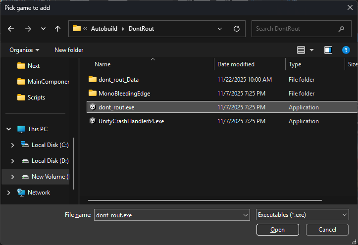 In the menu that pops up, click the "browse" button and find the unzipped game folder. Select "dont_rout.exe" and click "Open".