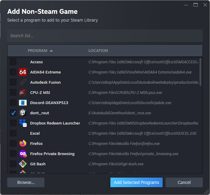 Now the game's exe should be visible and selected in the "Add Non-Steam Game" menu. Click "Add Selected Programs".